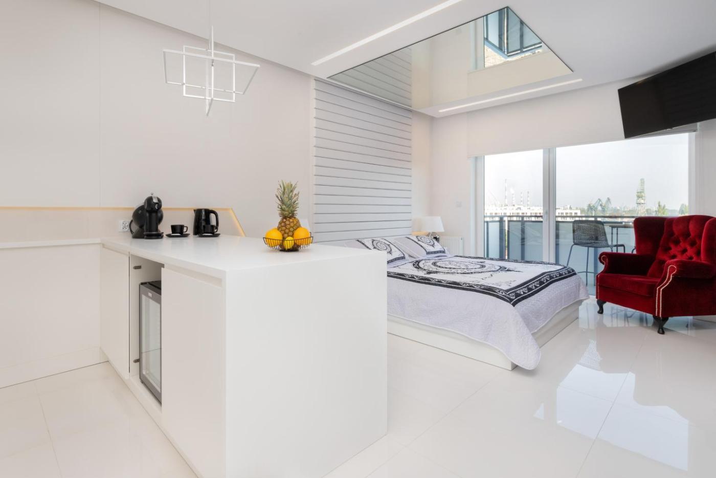 Studio z balkonem. Offering free toiletries and bathrobes, this studio includes a private bathroom with a bath, a shower and a hairdryer. In the fully equipped kitchen, guests will find a stovetop, a refrigerator, a dishwasher and kitchenware. Featuring a balcony with city views, this studio also offers a private entrance and a flat-screen TV. The unit offers 1 bed. Studio - 3 osobowy. Powierzchnia pokoju ok.: 33 mkw.