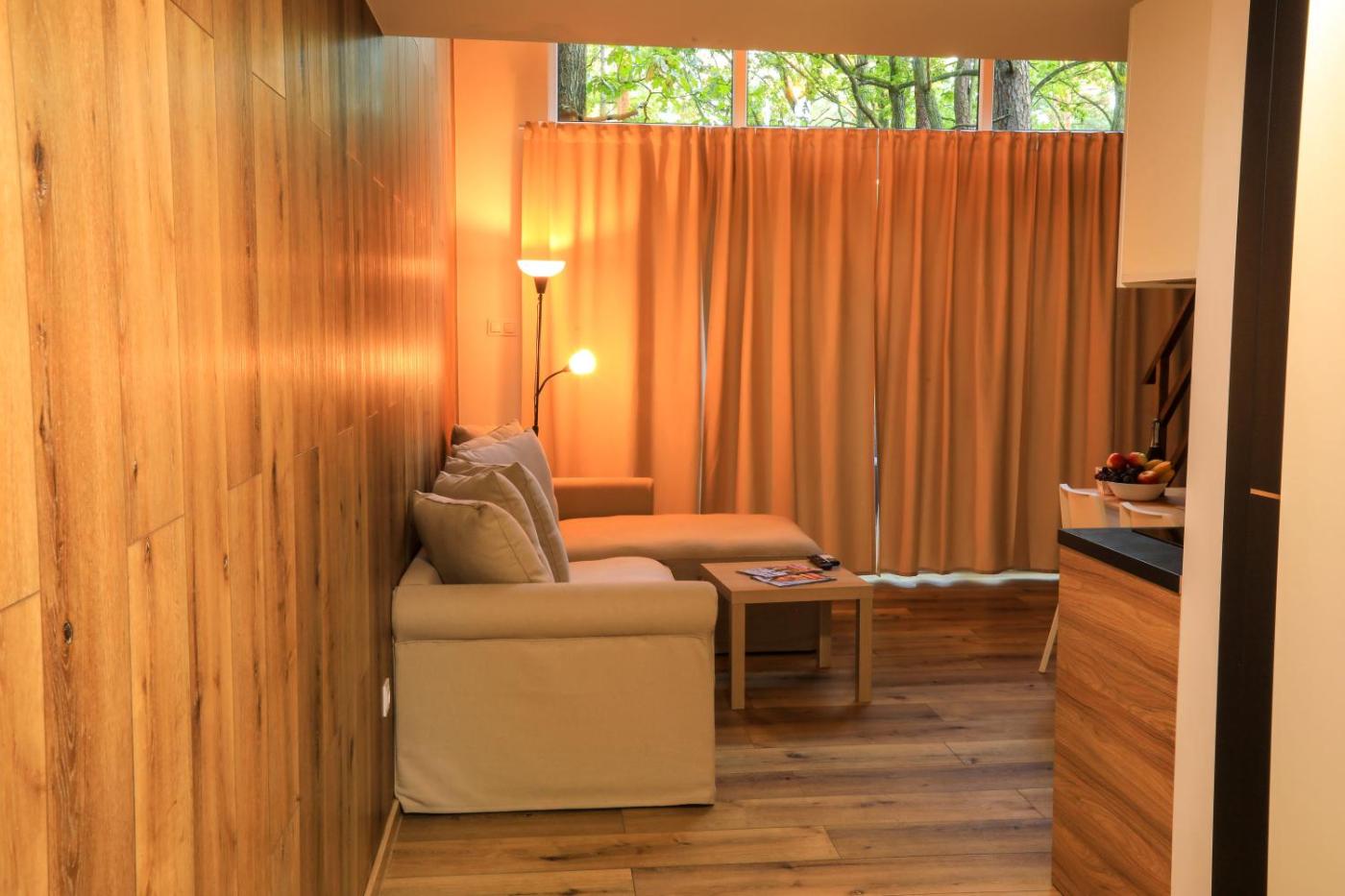 Domek typu Superior. Boasting a private entrance, this air-conditioned chalet includes 1 living room, 1 separate bedroom and 1 bathroom with a walk-in shower and a hairdryer. Guests will find a stovetop, a refrigerator, a dishwasher and kitchenware in the kitchen. The chalet also features a barbecue. Featuring a terrace with ancourtyard view, this chalet also offers a seating area and a flat-screen TV. The unit has 2 beds. Domek - 4 osobowy. Powierzchnia pokoju ok.: 45 mkw. ;